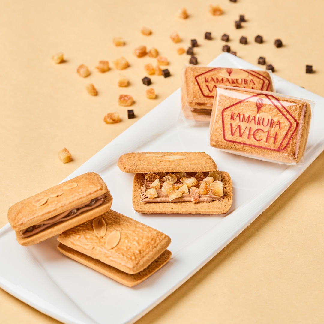 ビターチョコレートとカカオバターを使用した深みのあるチョコバタークリームに、爽やかな酸味と香りのオレンジピールをサンドした「セゾンウィッチ(ショコラオランジュ)」と、鎌倉ウィッチを代表するシンプルなおいしさの「鎌倉ウィッチ(ラムレーズン)」の2種類の詰合せ。