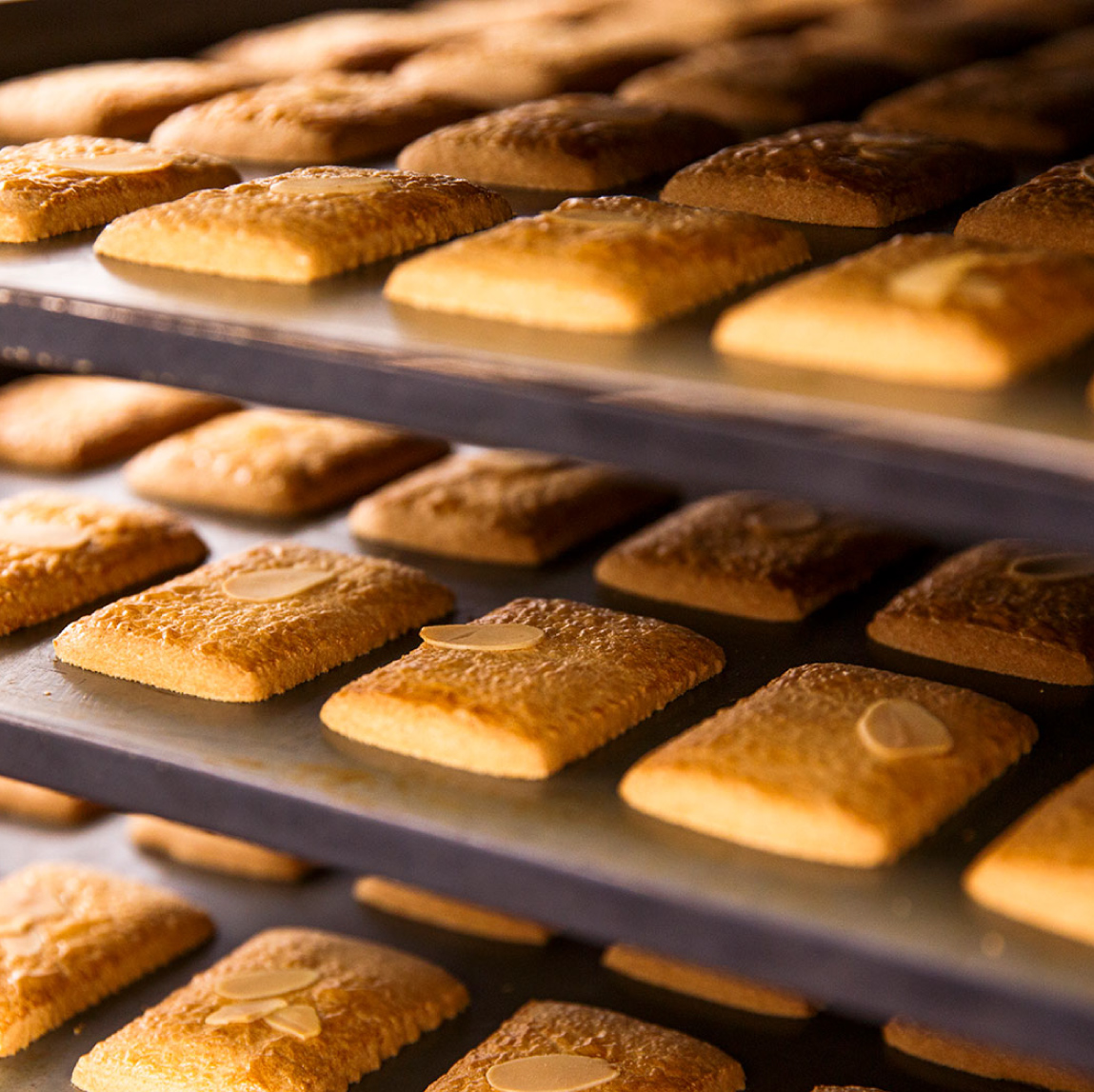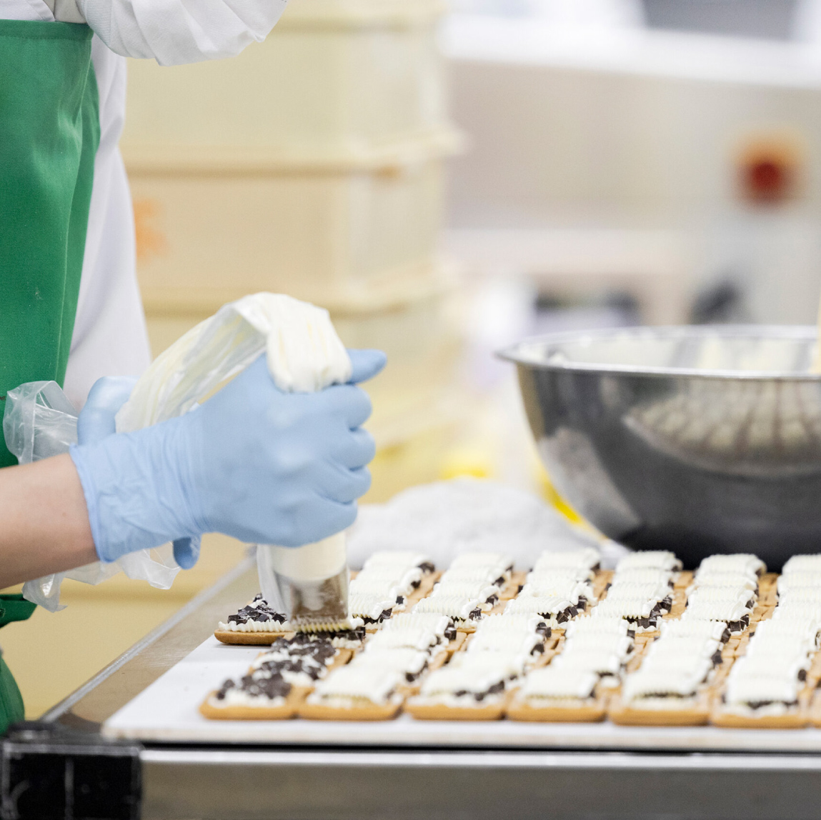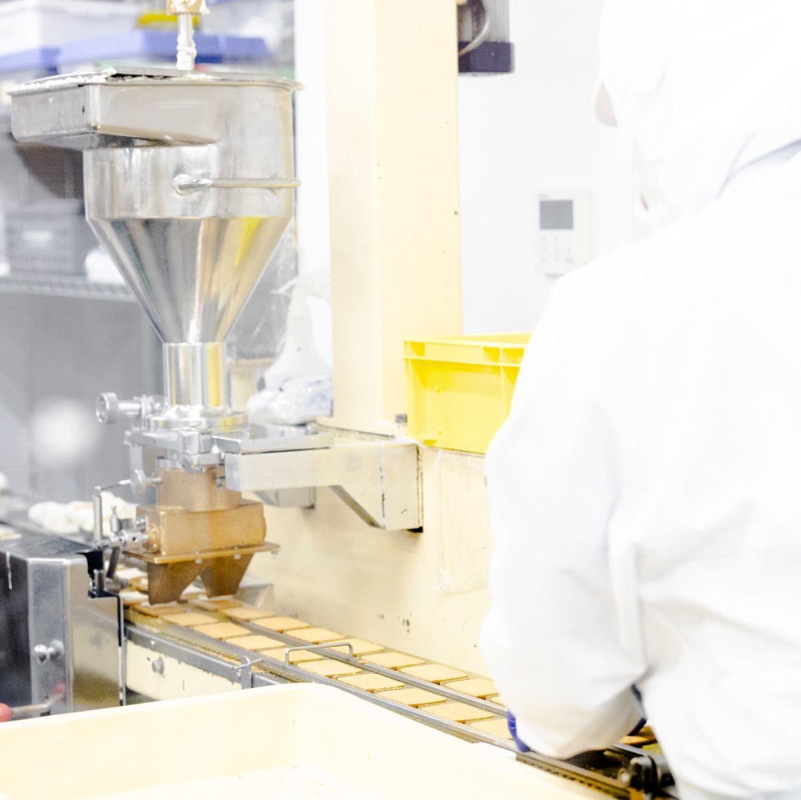 原材料の仕入れから生産、出荷に至るまで、徹底した品質管理を行なうことで、美味しいの笑顔につながる製品が生まれるのです。すべての工程で品質向上を実現するため、原材料の仕入れや生産、出荷の工程ごとにチェック項目を作成。イレギュラーな事態が発生した場合でも、すぐに対処できるような体制を整えています。たとえば、『鎌倉ウィッチ』を製造する場合、ビスケット生地の仕込み段階から焼成まで、温度などの状態を厳密に管理することで、より品質の高い安定した製品を作り上げることができるのです。そこに作り手の経験とノウハウを加えることでより良い商品を作り上げていきます。また衛生管理面ではHACCPの考え方に基づいた衛生・品質管理を行なうことで、安心・安全な環境を整えています。